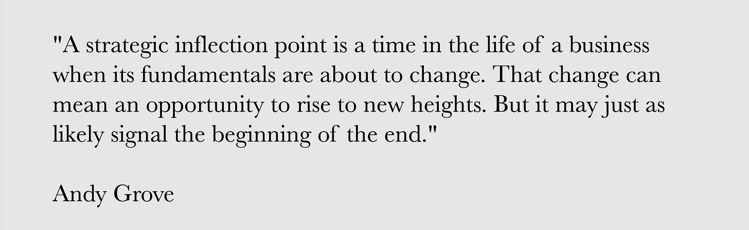 My view on inflections aligns with Andy Grove's but from another angle. Grove saw strategic inflections as significant threats that could overturn a company’s core business. Companies blind to these shifts or too slow to change risked their existence.