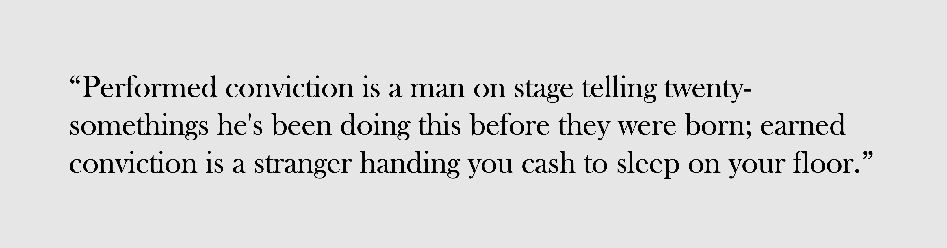 Performed conviction is a man on stage telling twenty-somethings he’s been doing this before they were born. Earned conviction is a stranger handing you cash to sleep on your floor.