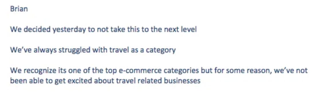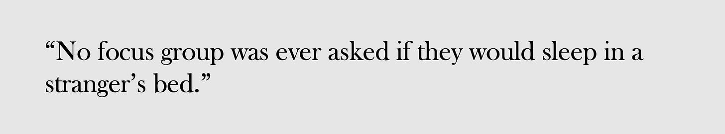 When Chesky and Gebbia pitched the air mattress idea, the patches came fast. “Normal travelers would never do this.” I know, because I made the mistake myself. In my pass note to Brian Chesky, I said I had concerns about travel-oriented startups. A masterpiece of missing the point.